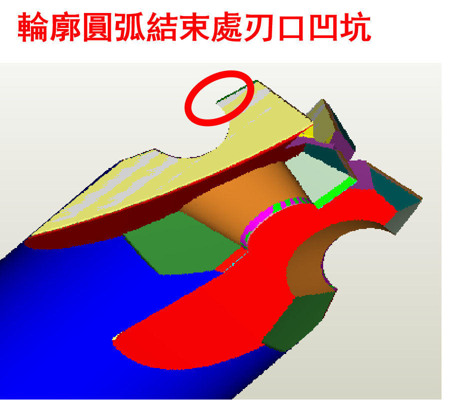 2.此類型刀具在工程設(shè)計(jì)段優(yōu)化程式, 解決了輪廓圓弧結(jié)束處刃口凹坑問題。